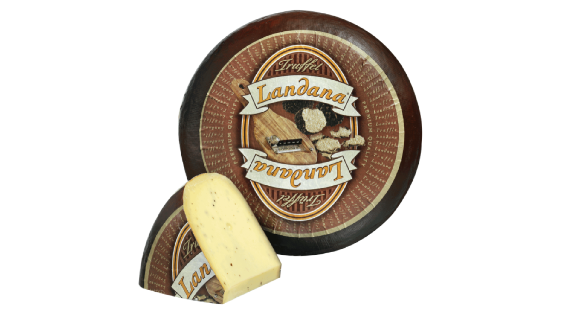 Sýr Landana Truffel je jemný holandský syr s kúskami čiernej hľuzovky, ktorá mu dodáva výraznú, luxusnú a zemito aromatickú chuť. Má hladkú, krémovú konzistenciu a elegantný chuťový profil, ktorý vynikne na pečive, v teplých jedlách aj ako gurmánsky doplnok k vínu. Je obľúbený pre svoju intenzívnu vôňu a prémiový charakter, typický pre hľuzovkové syry.